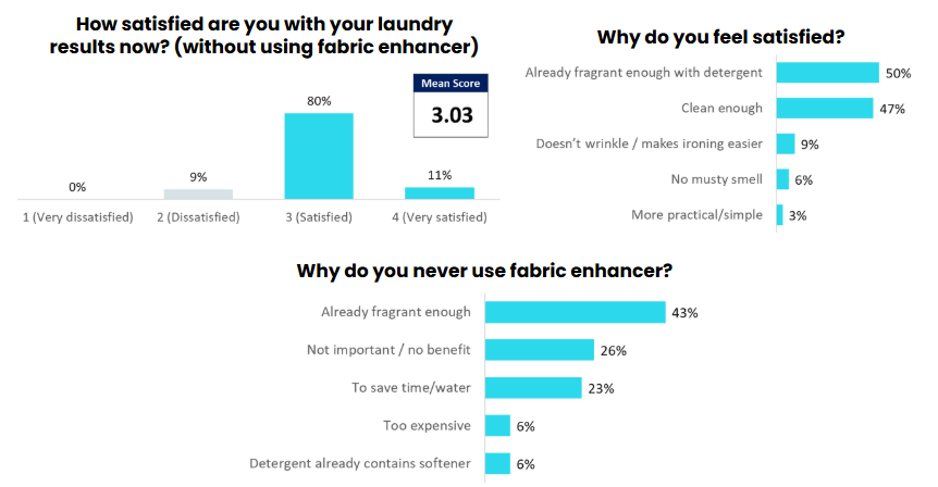 Most detergent only user are satisfied with their current laundry results without using additional fragrance, as they feel the detergent they use is already sufficiently fragrant and clean, and they see no importance or benefit in using a fabric enhancer.