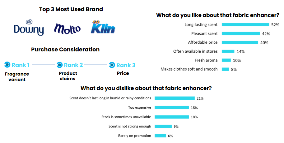 The top 3 fabric enhancers used are Downy, Molto, and So Klin, chosen mainly for their fragrance variety, product claims, and price. Consumers use them for their long-lasting scent, though it fades faster during the rainy season.