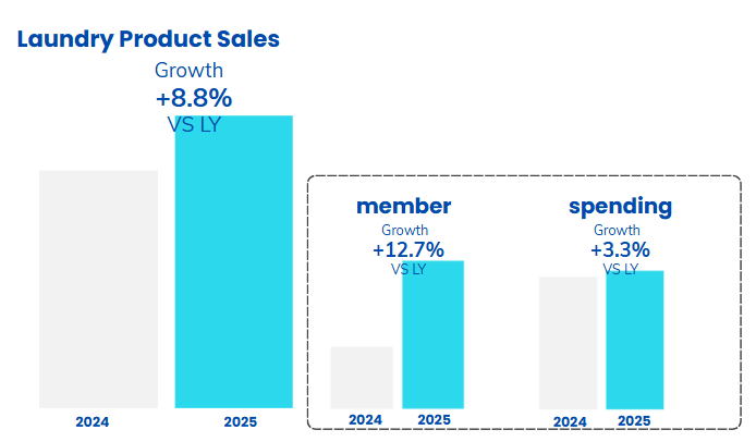 product on Laundry department has shown a positive uptick in sales, driven by a growing number of members purchasing from the category. In addition to the increase in member, a slight rise in average spending per customer—contributing to the overall sales growth.