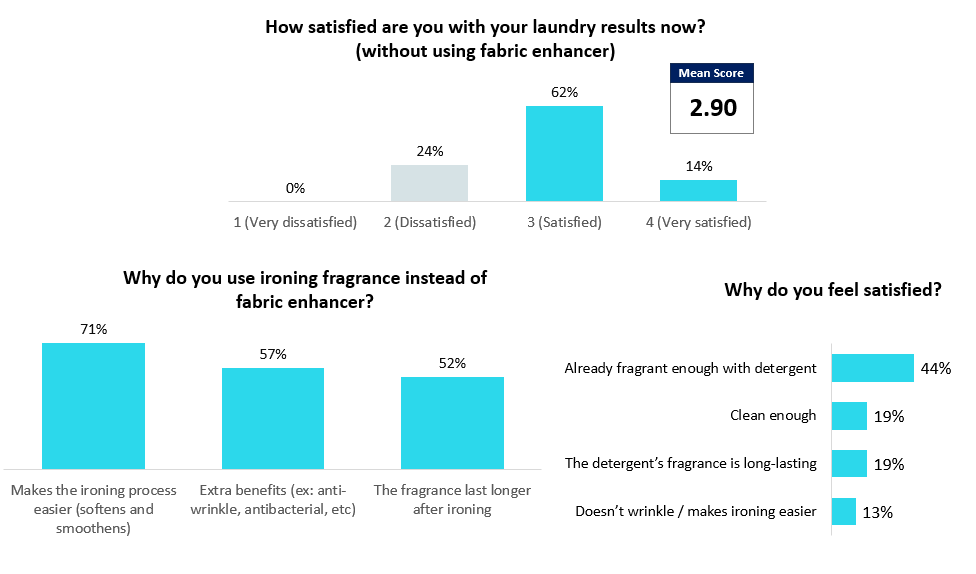 Most ironing perfume only users are satisfied with their laundry results without fabric enhancers, as their detergent is fragrant enough. They prefer ironing perfume for its ironing ease, added benefits, and longer-lasting scent.